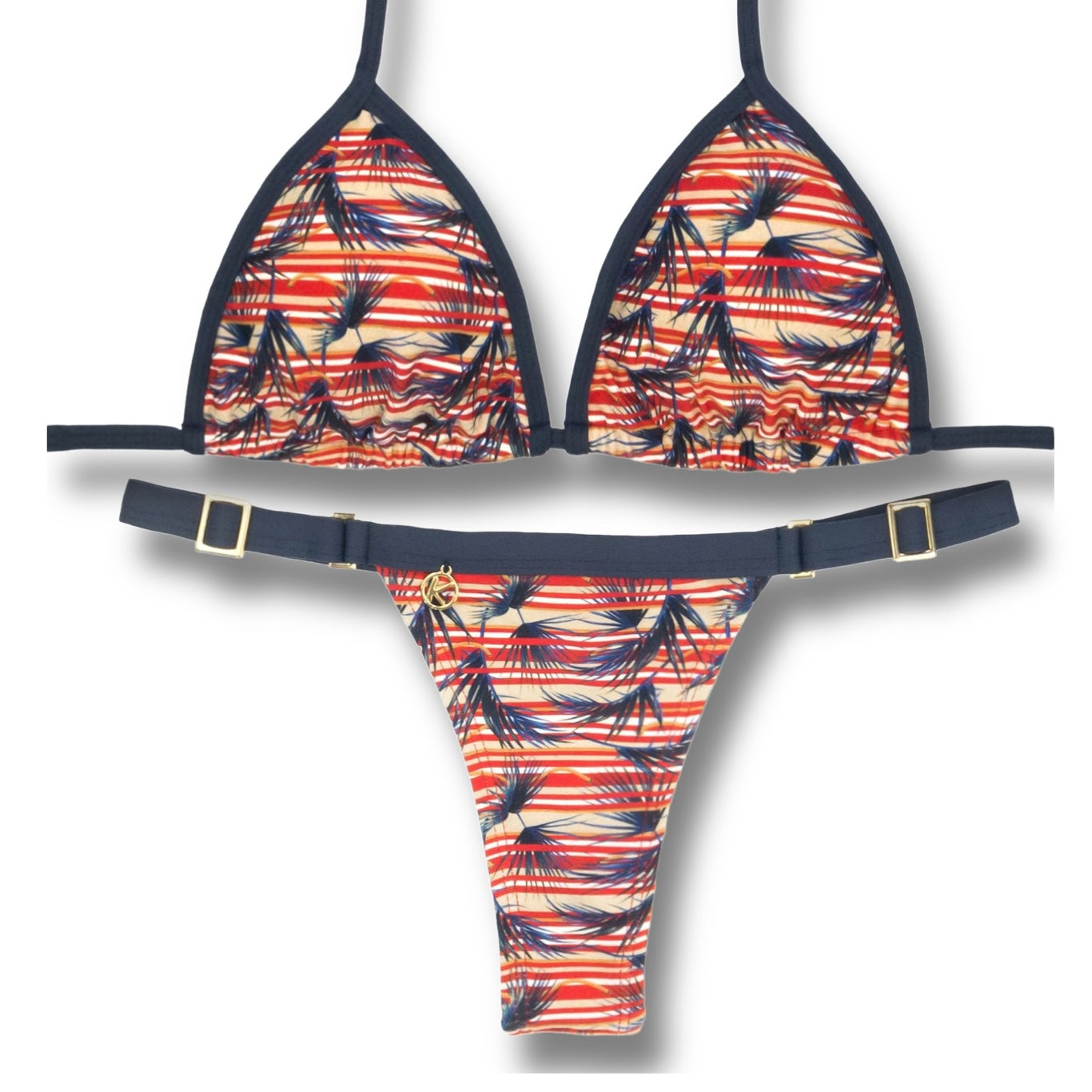 * Tanga fita Fany estampa folhagem retrô com a combinação em azul marinho