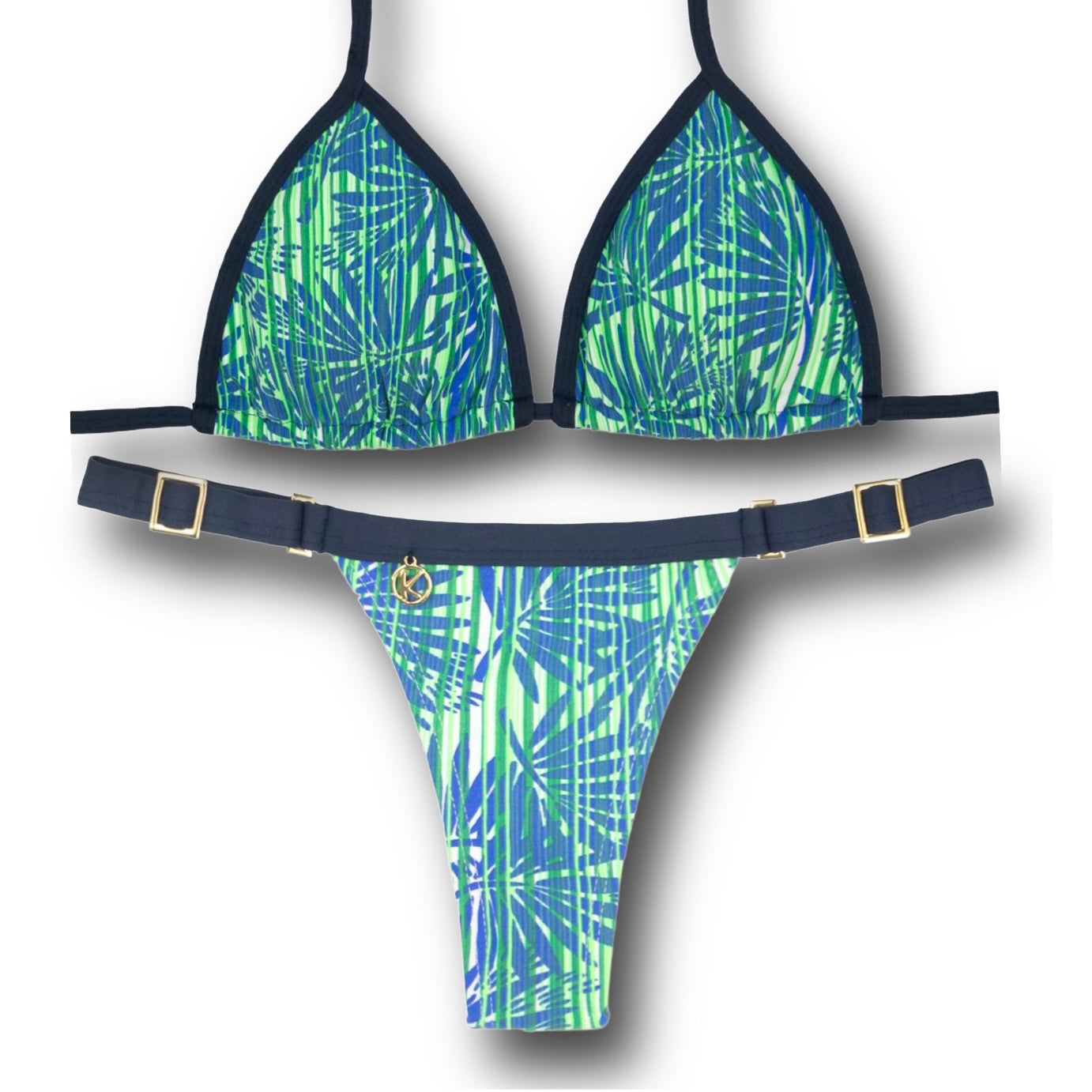 * Tanga fita Fany estampa folhagem tropical com a combinação azul
