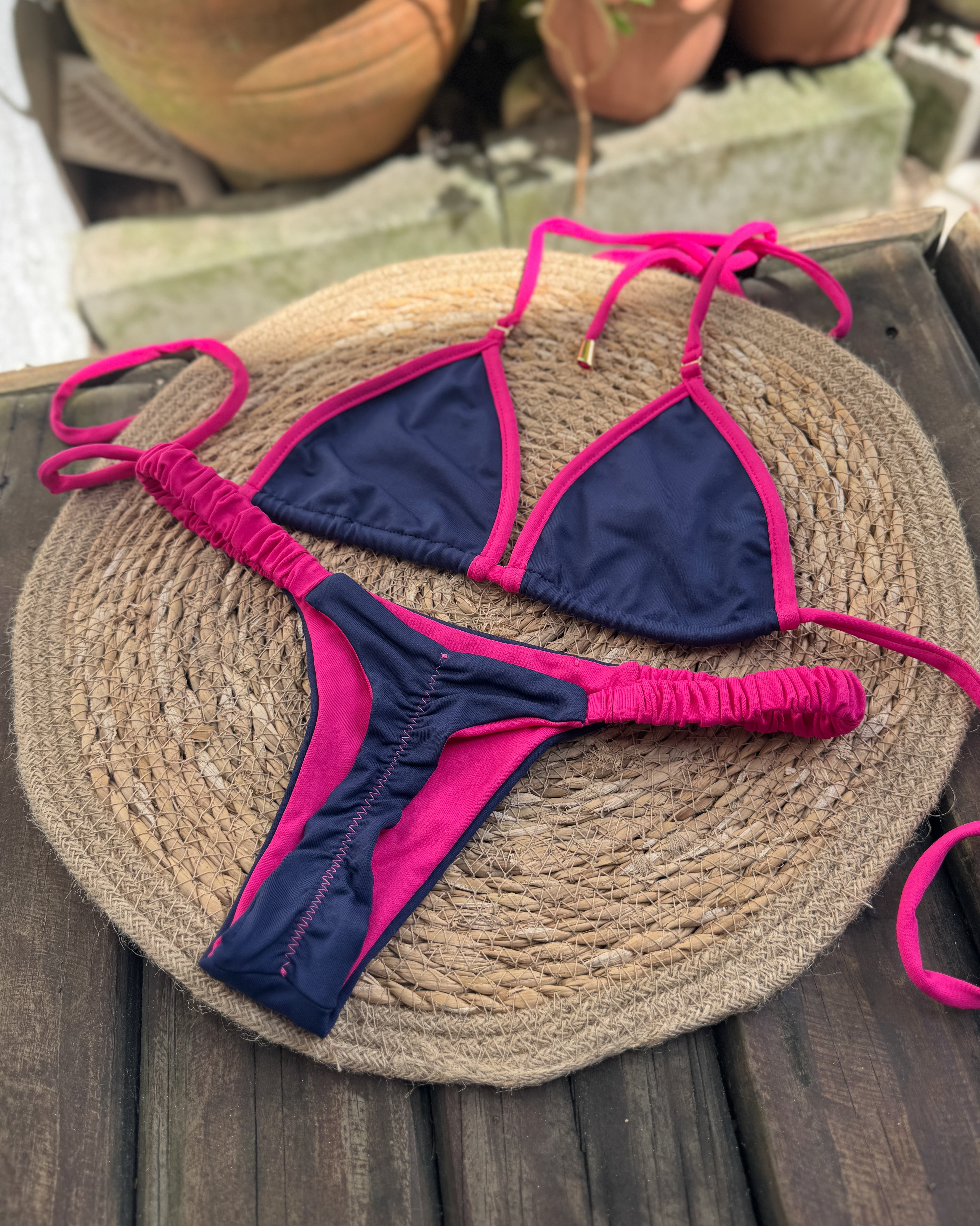 - Top em tecido liso na cor Marinho com a combinação em Pink.