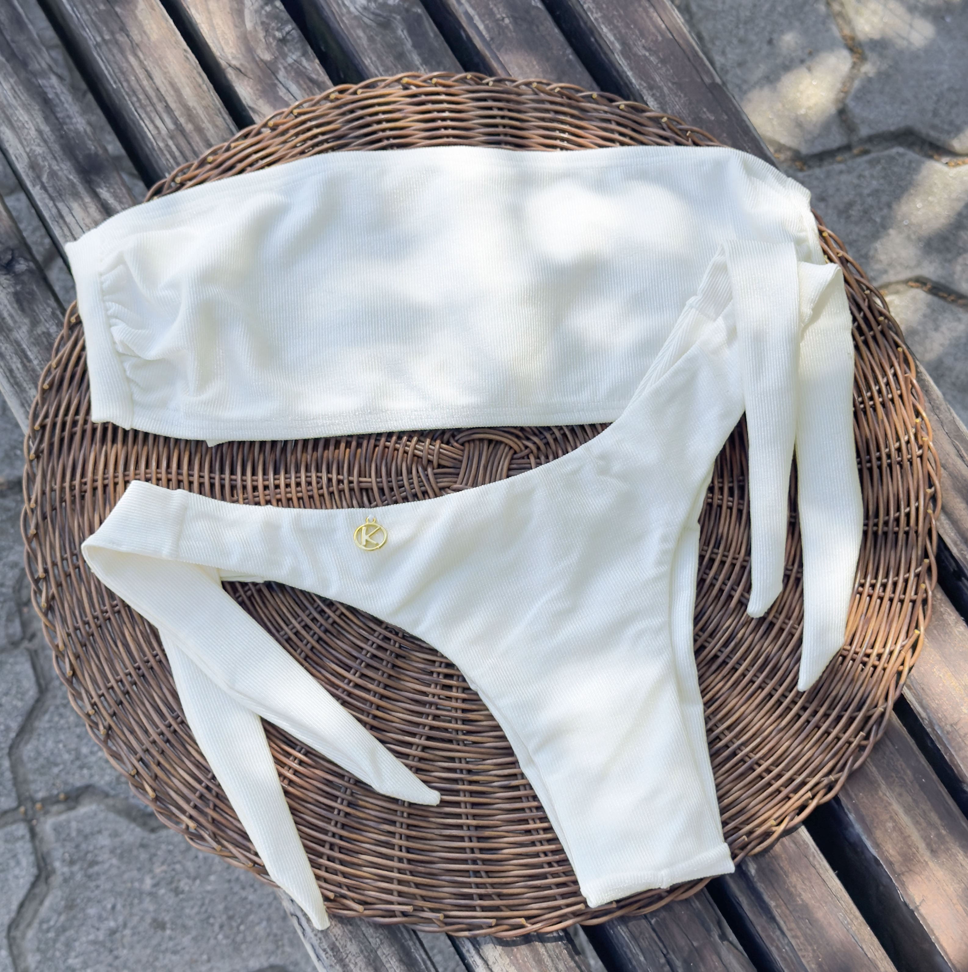 Conjunto de Biquini Pérola| Top Faixa + Tanga Mora | Tanga Com Amarração Lateral e Modelagem Levanta Bumbum | Top Faixa com amarração nas costas | Tecido Texturizado Off White