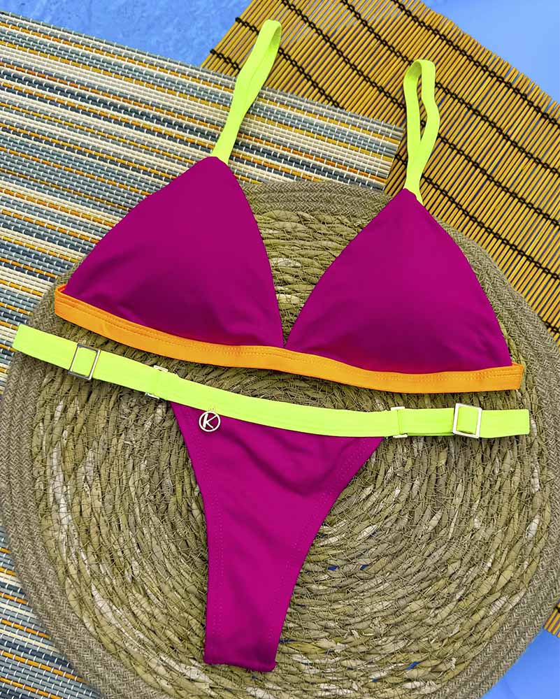 Conjunto de Biquíni Tricolor Pink Twist | Top Jade + Tanga Fany | Tanga marquinha perfeita com regulador na lateral | Top fixo com regulador na alça e abertura para bojo | Pink, Laranja e Amarelo Neon