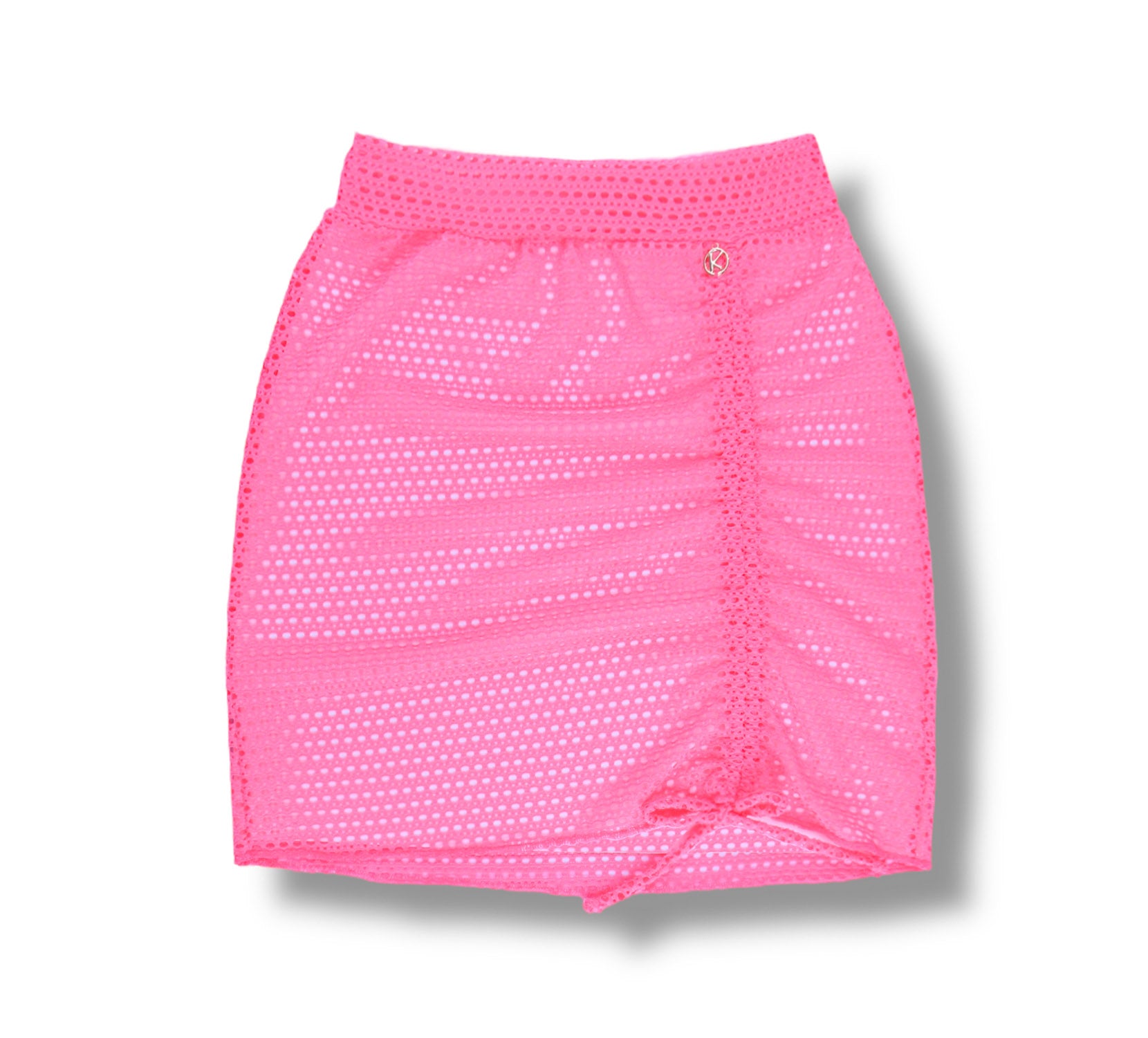 * Saia de Praia com transparência, feita com tela arrastão Mesh Glass na cor rosa neon