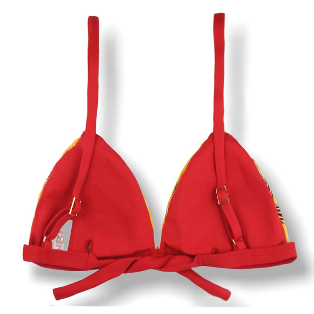 Top Jade Amarelo Tropical | Cortininha Triângulo Fixo | Estilo Sutiã com Amarração nas Costas | Alças com Regulagem | Biquíni Estampado | Detalhes Vermelho Carmim