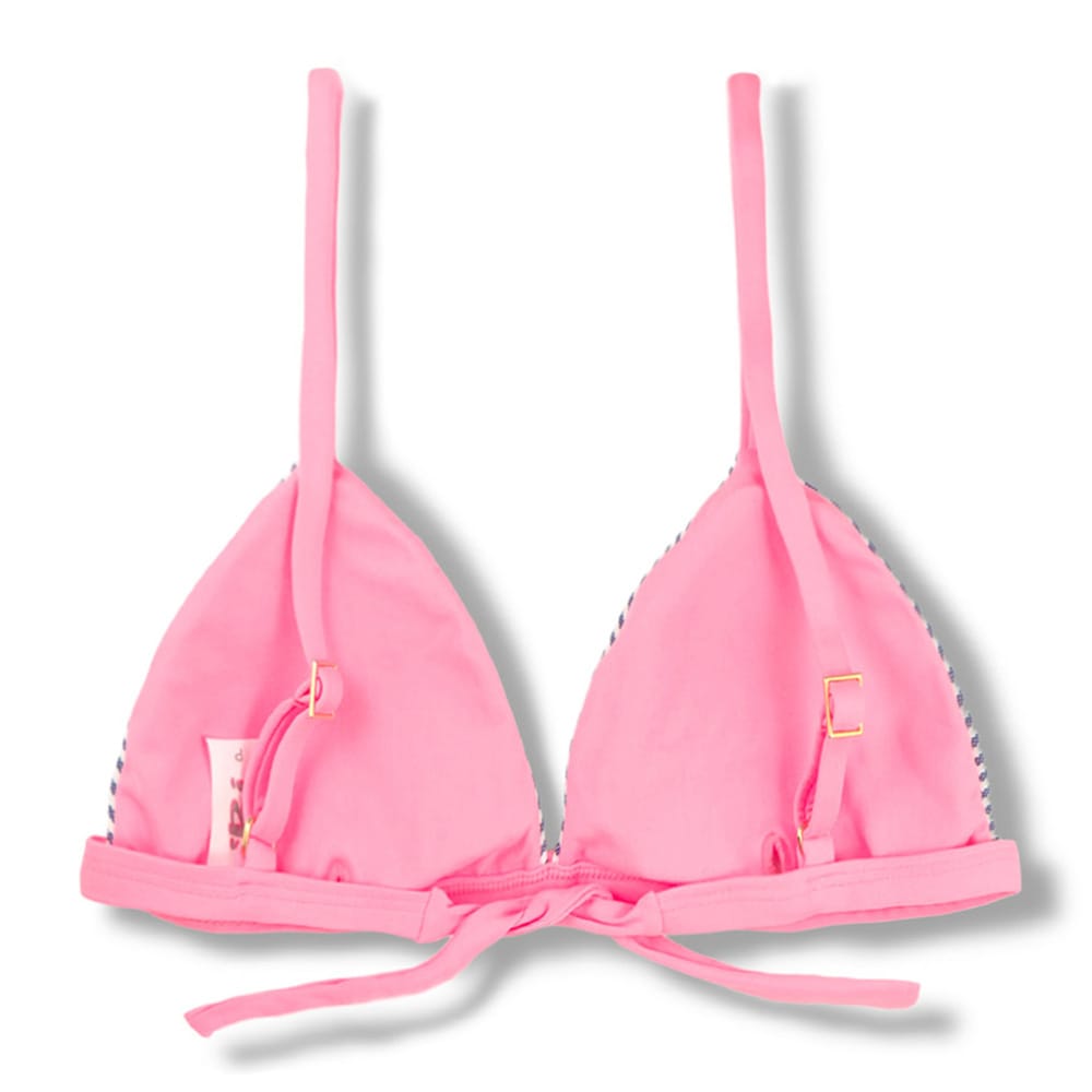 Top Jade Denim | Cortininha Triângulo Fixo | Estilo Sutiã com Amarração nas Costas | Alças com Regulagem | Biquíni Listrado | Detalhes Rosa Iogurte